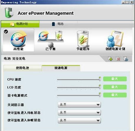 Acer Epower Management是轉(zhuǎn)為宏基電腦鎖打造的一款電源管理軟件,用來(lái)調(diào)節(jié)筆記本電腦中CPU和顯卡的頻率,進(jìn)行關(guān)閉顯示器、關(guān)閉硬盤(pán)、系統(tǒng)待機(jī)等操作,內(nèi)置四種模式,方便用戶(hù)管理計(jì)算機(jī)的性能,隨意修改。