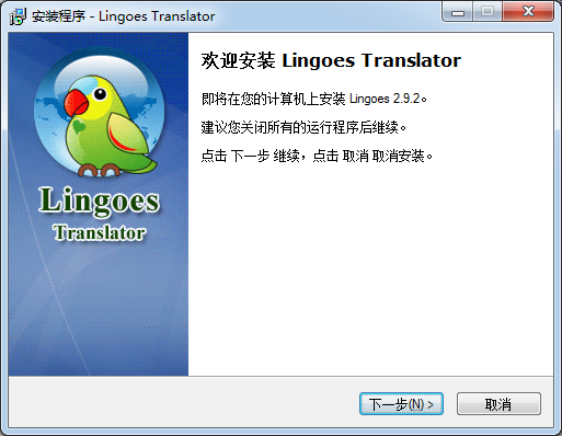 2.歡迎安裝Lingoes Translator即將在您的計算機上安裝Lingoes 2.9.2。建議您關閉所有的運行程序后繼續(xù)。點擊下一步維續(xù)。點擊取消取消安裝。