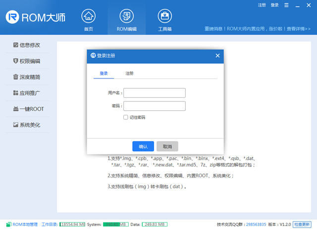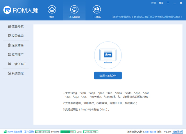 ROM大師是一款簡單易用又專業(yè)的rom文件解包打包工具,支持所有機型的ROM編輯,支持*.img、*.cpb、*.app、*.pac、*.bin、*.binx、*.ext4、*.qsb、*.dat、*.tar、".tgz、*.rar、*.new、*.dat、*.tar、*.md5、7z、zip等格式的解包打包,支持系統(tǒng)精簡、信息修改、權限編輯、內置ROOT、系統(tǒng)美化,可以任意刪除不需要的內置軟件,是一款專業(yè)強大的ROM定制工具!