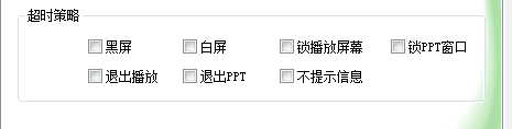 超時策略,可以選擇顯示的時鐘、提示鈴聲、密碼解鎖、黑屏、白屏、鎖播放屏幕、鎖PPT窗口、推出播放、推出PPT、不提示信息