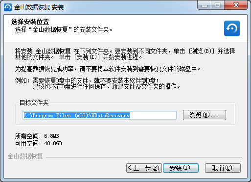 將安裝金山數(shù)據(jù)恢復(fù)在下列文件夾。要客裝到不同文件夾,單擊[瀏覽B)】并選擇