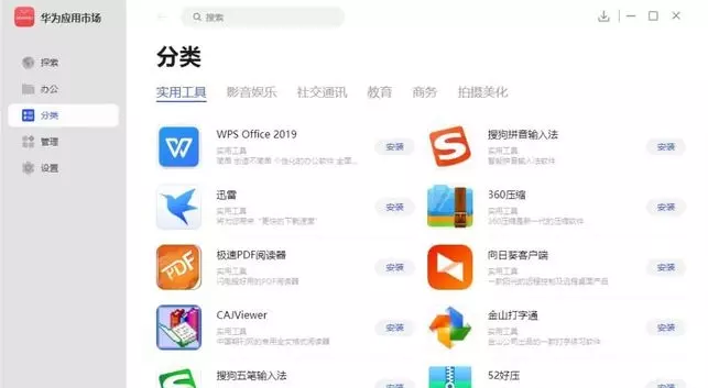 點(diǎn)進(jìn)分類,可以看到應(yīng)用被分為實(shí)用工具、影音娛樂、社交通訊、教育、商務(wù)、拍攝美化六類。