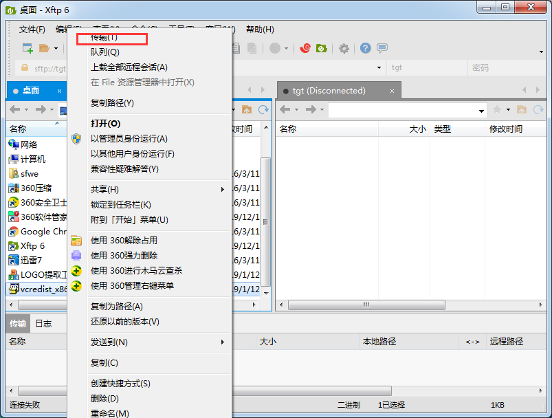 4、在左側(cè)點擊鼠標右鍵,在彈出的選項中點擊傳輸。