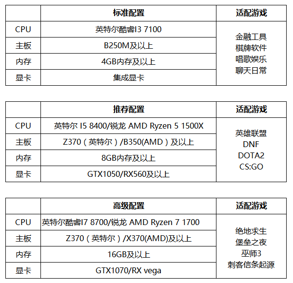 主要以一些熱門游戲英雄聯盟、DOTA2、絕地求生等為例,推薦機器配置,見下圖所示: