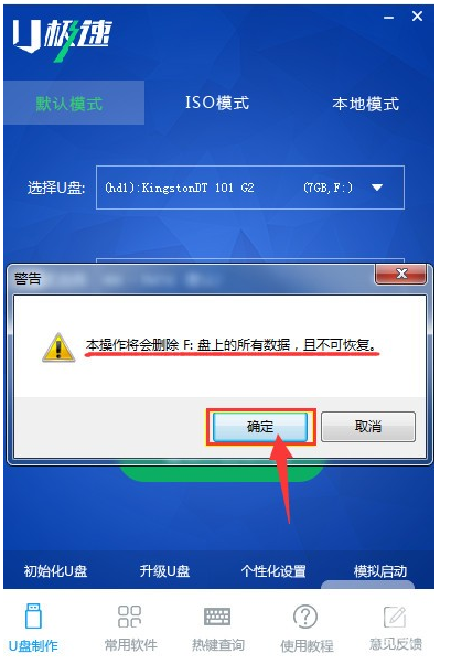 選擇結(jié)束,即可點擊"一鍵制作啟動U盤"按鈕,將會彈出新的提示窗口,警告用戶在制作U盤啟動盤將會格式化U盤,U盤中的所有數(shù)據(jù)將會清空,可將U盤中的文檔文件存儲至本地磁盤進行備份,確認(rèn)無誤后點擊"確定"即可開始制作;