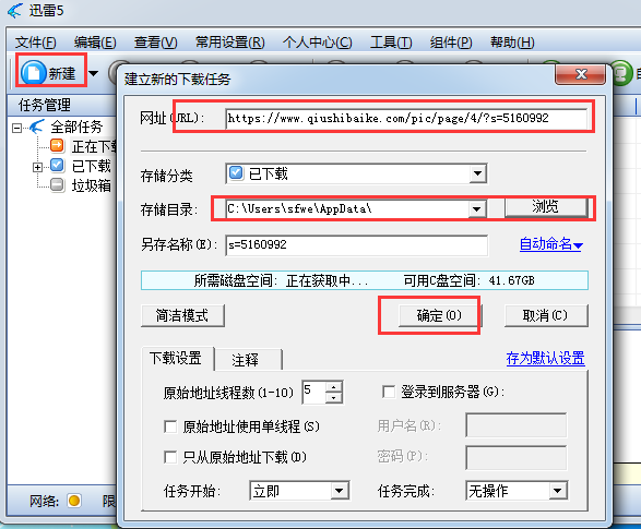 2.輸入網(wǎng)址,設(shè)置存儲目錄等信息,完成后點擊確定即可