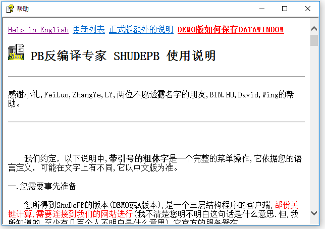 Shudepb PB反編譯專家可以說是目前最強大的PB反編譯工具,全面支持反編譯PB5.0/PB6.5/PB7.0/PB8.0/PB9.0/PB10.0/PB10.5/PocketBuilder2.0.x/2.5.x/ PB11CTP/Beta1/Beta2/PB11/PB11.1/PB11.2/ PB11.5/ pb12的反編譯。支持對Powershield處理過程序的反編譯.正式版支持反編譯后直接將PBD保存為PBL。