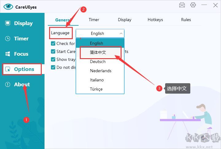 CareUEyes默認(rèn)是英文界面,如果需要中文界面的朋友,可以點擊options-language,選擇簡體中文即可!