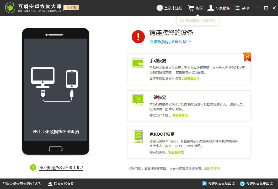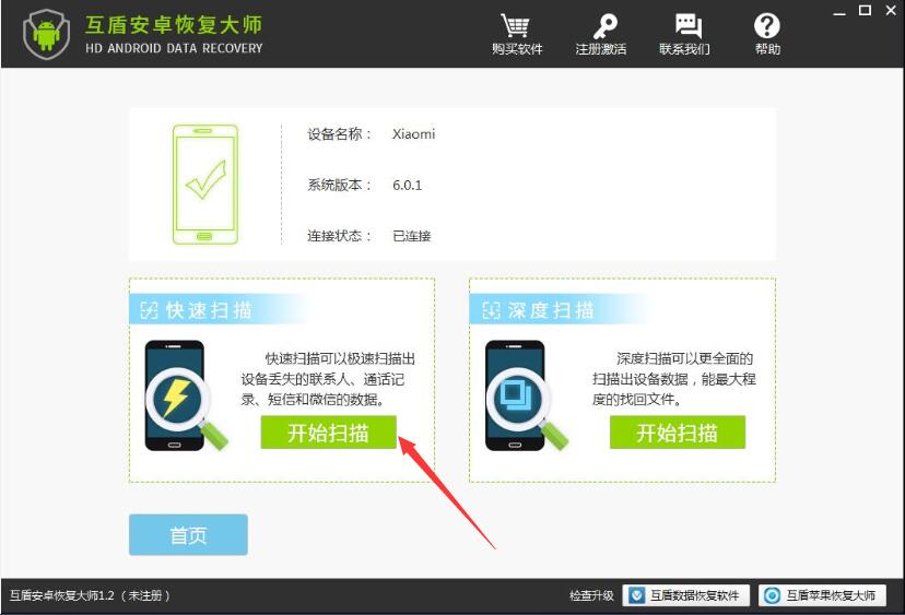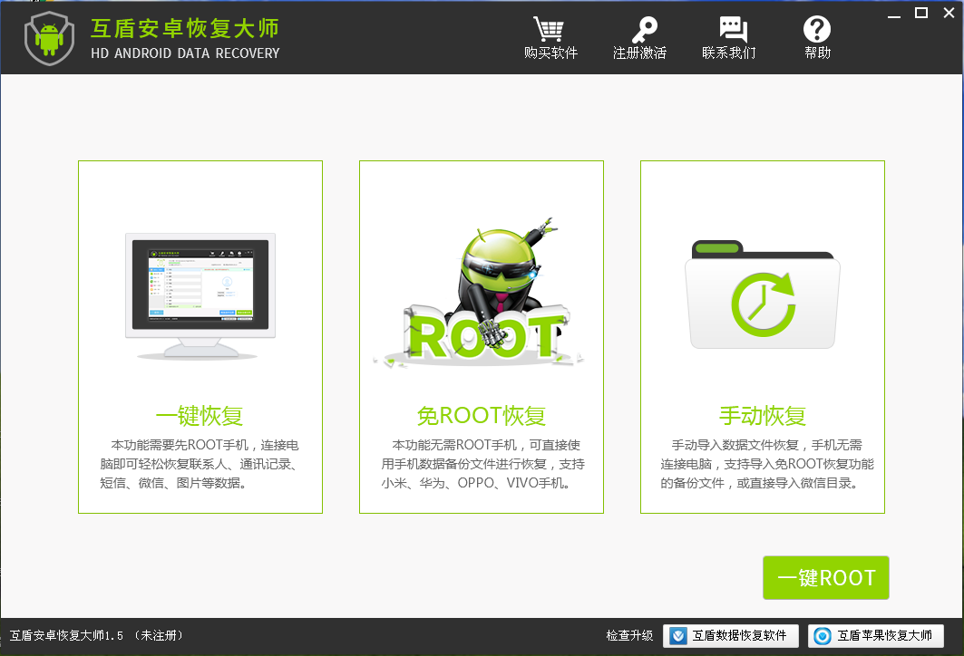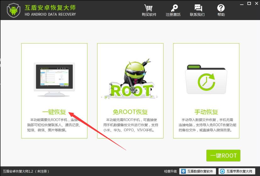 1.打開互盾安卓恢復(fù)大師,此時(shí)可以看到軟件界面的三個(gè)恢復(fù)模式,一般選擇“一鍵恢復(fù)”模式即可。