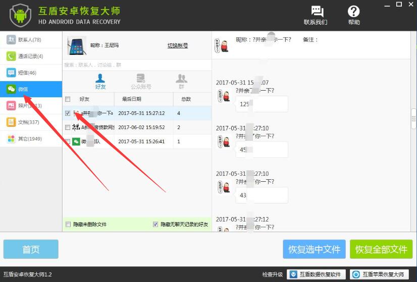 6、最后我們只需要點(diǎn)擊“恢復(fù)選中文件”就可以將已經(jīng)刪除的微信聊天記錄恢復(fù)回來(lái)。點(diǎn)擊“查看”按鈕就可以看到恢復(fù)的微信聊天記錄了。