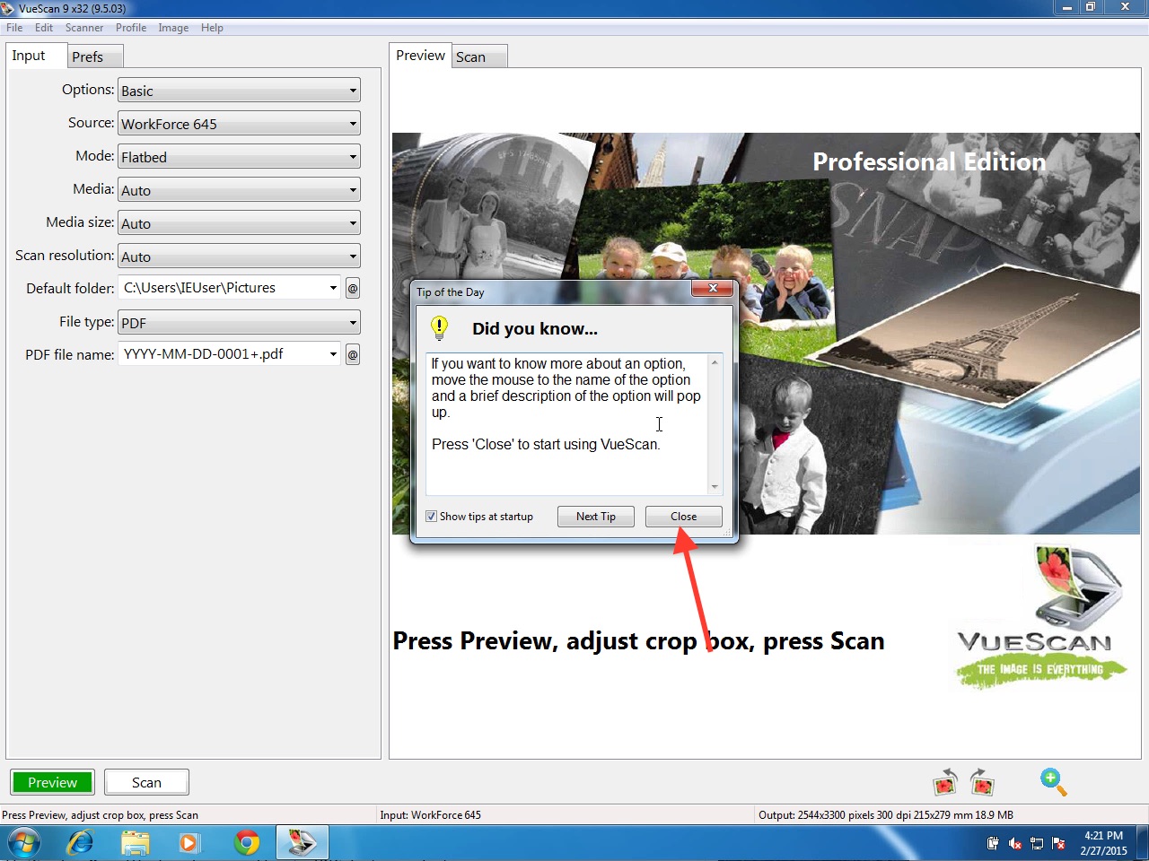 按“關(guān)閉”關(guān)閉當(dāng)天的提示并啟動VueScan;