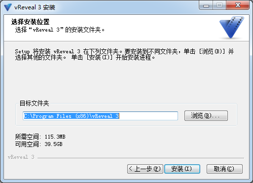 4.setup將安裝vReveal3在下列文件夾,要安裝到不同文件夾,單擊[瀏覽]并選擇其他的文件夾。單擊安裝開(kāi)始安裝程序,點(diǎn)擊瀏覽選擇安裝位置