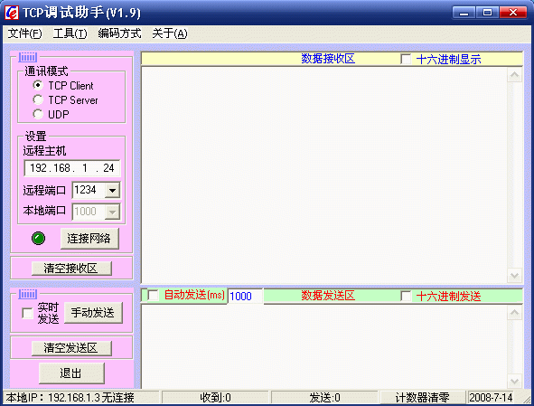 TCP調(diào)試助手是款綠色免費(fèi)的輔助調(diào)試UDP/TCP的工具,支持TCP Server、TCP Client、UDP等通信模式,可以幫助你檢查網(wǎng)絡(luò)應(yīng)用軟件及硬件的通訊情況,支持hex發(fā)送和定時(shí)發(fā)送,為網(wǎng)絡(luò)調(diào)試提供極大的方便。