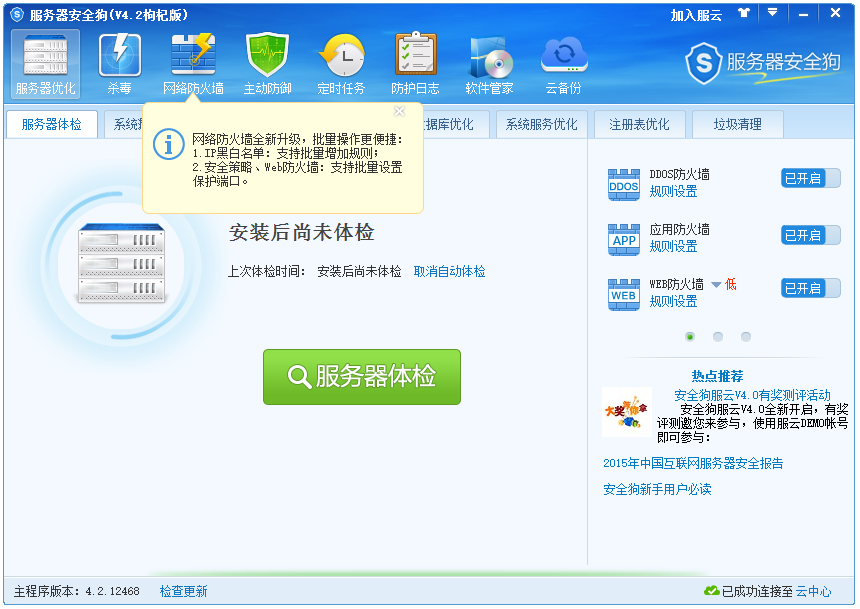 服務(wù)器安全狗是一款專(zhuān)業(yè)智能的服務(wù)器安全防護(hù)管理軟件,保護(hù)服務(wù)器的安全,主要功能有:服務(wù)器優(yōu)化、遠(yuǎn)程監(jiān)控、云備份、殺毒等,使用這款服務(wù)器安全狗可以有效保全服務(wù)器安全、發(fā)現(xiàn)漏洞的話(huà)會(huì)進(jìn)行及時(shí)的修復(fù)。