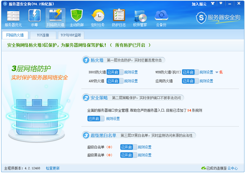 1、打開(kāi)服務(wù)器安全狗軟件,進(jìn)入界面,點(diǎn)擊【網(wǎng)絡(luò)防火墻】,將相關(guān)安全全部開(kāi)啟:DDOS防火墻、CC攻擊、ARP防火墻、應(yīng)用防火墻,