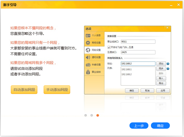 3、點(diǎn)擊內(nèi)網(wǎng)通軟件選項(xiàng)界面左側(cè)的【網(wǎng)段設(shè)置】,在右側(cè)輸入自己的IP地址,然后點(diǎn)擊【確定】。