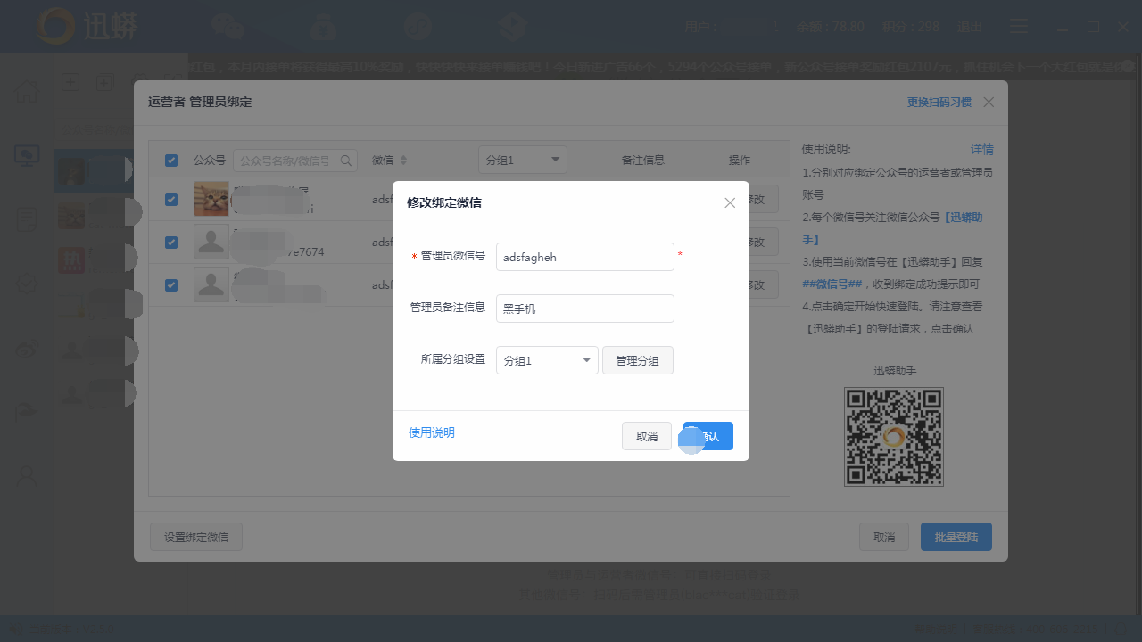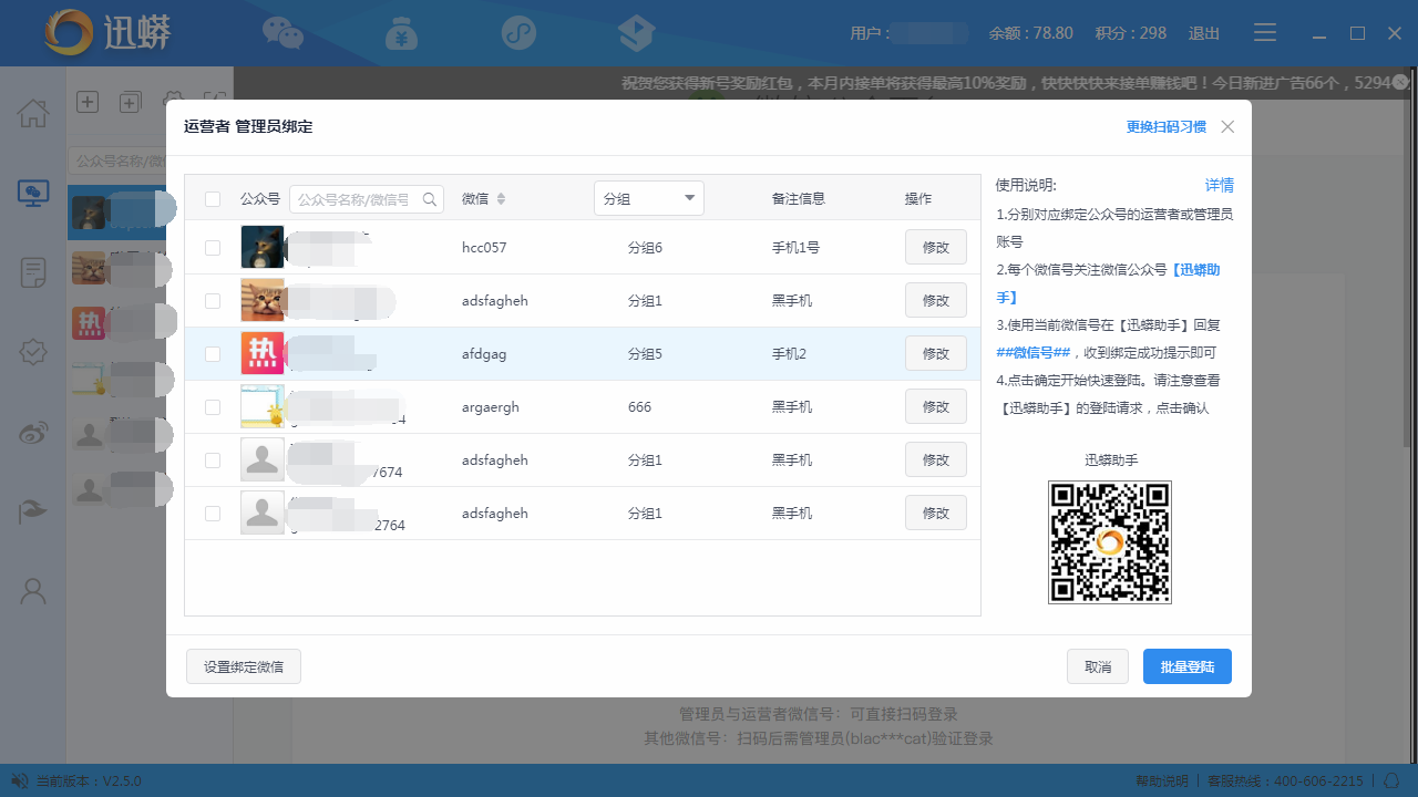 1.選擇需要批量登錄的公眾號,可以單選或者多選。單選直接選擇每個公眾號后的“修改”按鈕,批量請在勾選完之后點(diǎn)擊下方的 “修改綁定微信”。