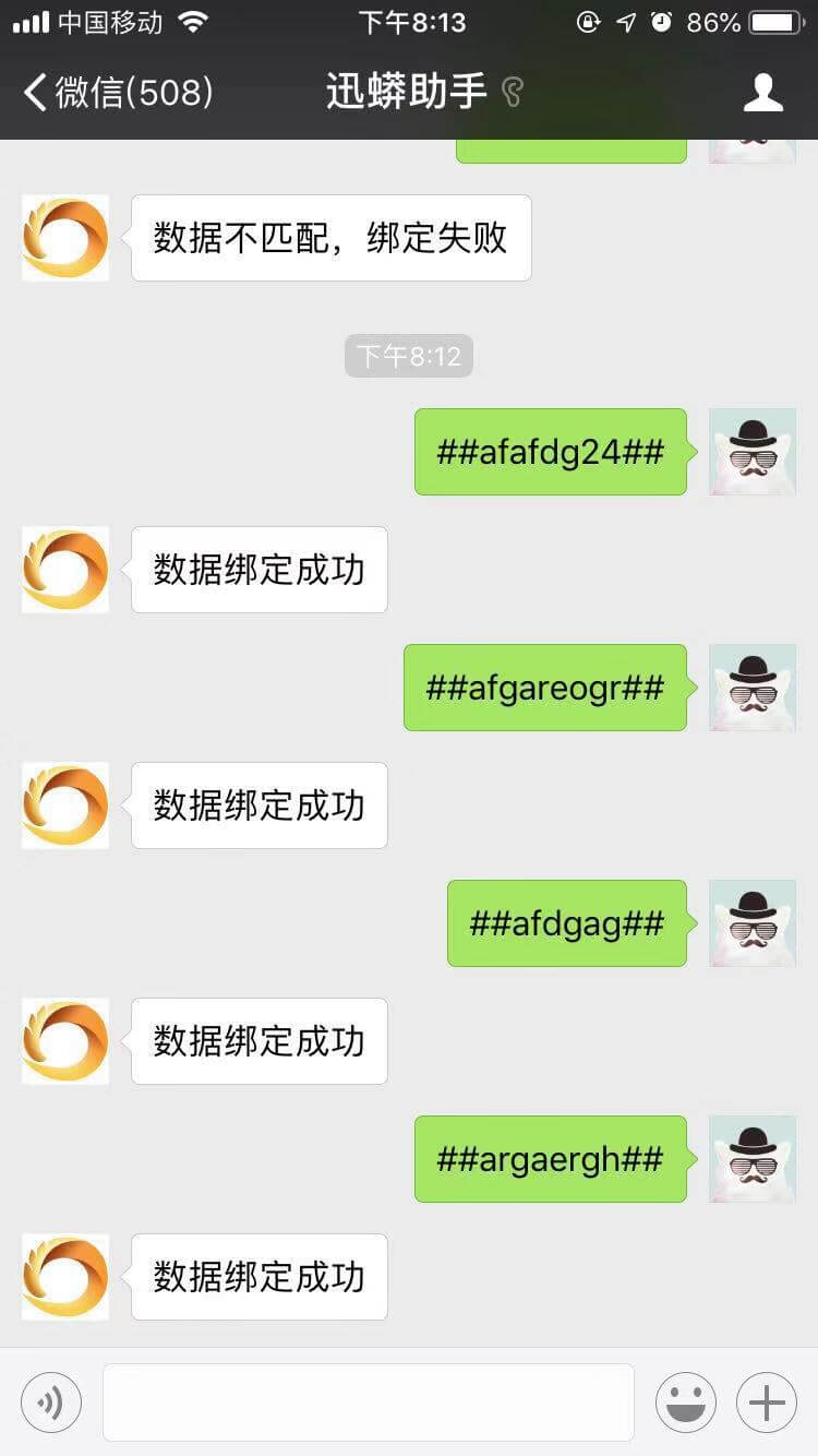2.用該微信,在【迅蟒助手】回復(fù)##迅蟒賬號,迅蟒密碼##,微信號顯示綁定成功,前期的設(shè)置步驟就完成了。(需提交后2小時內(nèi)到手機(jī)端綁定)