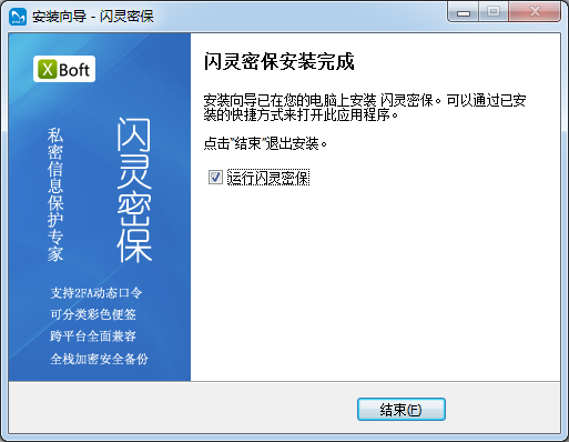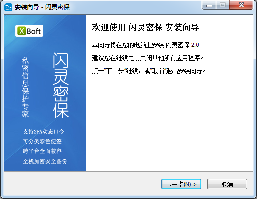 1.歡迎使用閃靈密保安裝向?qū)П鞠驅(qū)⒃谀碾娔X上安裝閃靈密保2.0建議您在繼續(xù)之前關(guān)閉其他所有應(yīng)用程序。點擊"下一步"維續(xù),或"取消"退出安裝向?qū)А?/p>