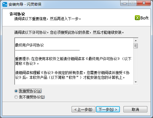 2.歡迎使用閃靈密保安裝向?qū)П鞠驅(qū)⒃谀碾娔X上安裝閃靈密保2.0建議您在繼續(xù)之前關(guān)閉其他所有應(yīng)用程序。點擊"下一步"維續(xù),或"取消"退出安裝向?qū)А?/p>