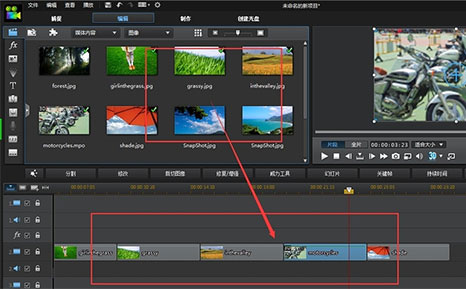 1、將需要制作成視頻的照片全部導(dǎo)入進威力導(dǎo)演,并根據(jù)自己的需要將照片按照一定順序?qū)У綍r間線上,如下圖: