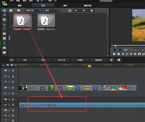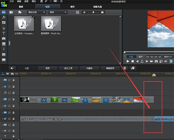 4、將準備好的音樂文件也導(dǎo)入到時間線上的音頻層,開始音頻跟視頻對應(yīng)。