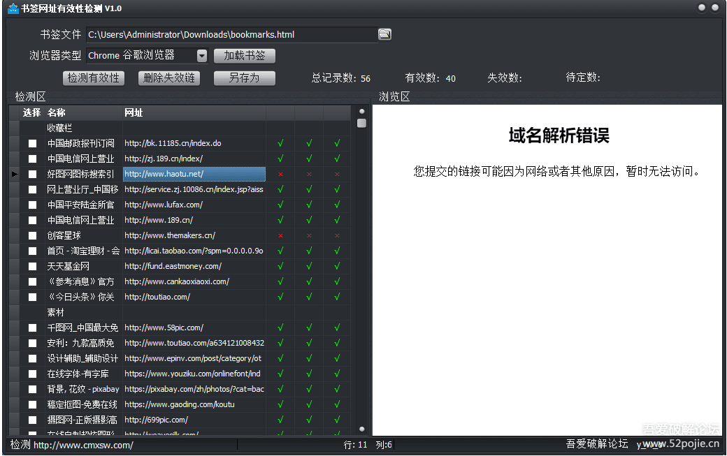 使用瀏覽器瀏覽網(wǎng)站的時候一些喜歡的網(wǎng)頁就會被用戶加入收藏夾,久而久之可能會有很多失效的,一個一個打開看會非常麻煩,這里給大家提供一款書簽有效性檢測工具,可以檢測收藏夾中網(wǎng)址的有效性,還可以刪除那些失效沒用的網(wǎng)址,有需要的朋友不要錯過。