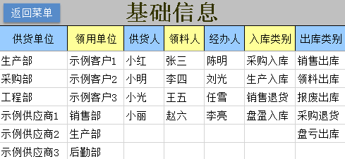 主要包括:供貨單位(供應(yīng)商)、領(lǐng)用單位、供貨人、領(lǐng)料人、經(jīng)辦人、入庫(kù)類別、出庫(kù)類別。庫(kù)存管理系統(tǒng)里已提供了一些示例的數(shù)據(jù),可以根據(jù)自己的實(shí)際情況添加、刪除或修改?;A(chǔ)信息列表里的數(shù)據(jù),會(huì)在以后的出入庫(kù)操作中頻繁調(diào)用,以減少手工輸入的麻煩。