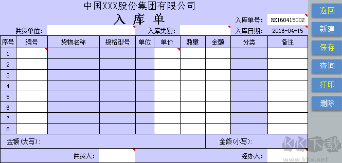 1、基本信息:供貨單位、出入類別、供貨人(領(lǐng)料人)、經(jīng)辦人,都可以通過(guò)下載列表選擇,表格會(huì)自動(dòng)調(diào)用系統(tǒng)設(shè)置/基礎(chǔ)信息列表里的數(shù)據(jù)。