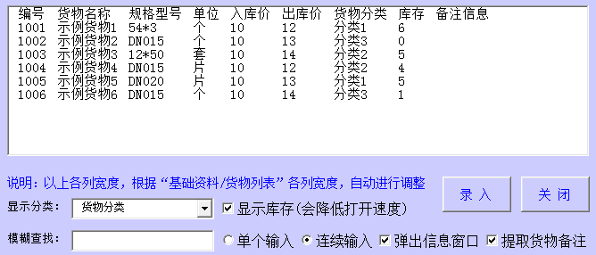 貨物瀏覽窗口中列表的各列寬度,根據(jù)“系統(tǒng)設(shè)置/貨物列表”各列寬度,自動(dòng)調(diào)整。同時(shí),還可以選擇是否連續(xù)輸入、是否彈出單價(jià)輸入窗口等。