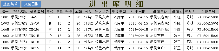 上面截圖顯示的是沒(méi)有輸入貨物編號(hào),查詢指定日期段的所有貨物出入庫(kù)明細(xì)報(bào)表。