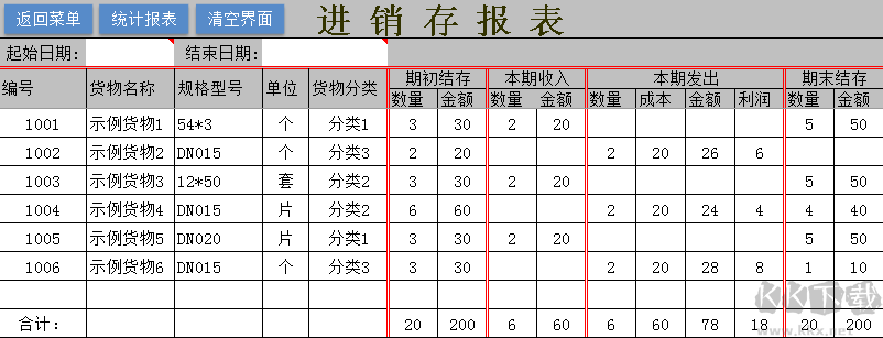 輸入需要查詢的起止時(shí)間,然后點(diǎn)擊“統(tǒng)計(jì)”按鈕,就可以查詢所有貨物的進(jìn)銷存報(bào)表,這里會(huì)自動(dòng)計(jì)算與匯總貨物的期初結(jié)存,本期收入、本期發(fā)出,期末結(jié)存等信息,其中的發(fā)出成本使用移動(dòng)加權(quán)平均法進(jìn)行核算。