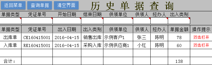 在主界面點(diǎn)擊“單據(jù)查詢”,可以查詢以前登記過(guò)的出入庫(kù)單據(jù)。