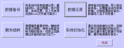 ?。?)期末結(jié)轉(zhuǎn):清理編號(hào)重復(fù)貨物,刪除所有進(jìn)出數(shù)據(jù),使用當(dāng)前庫(kù)存轉(zhuǎn)為期初庫(kù)存,可防止數(shù)據(jù)過(guò)多的運(yùn)行壓力。