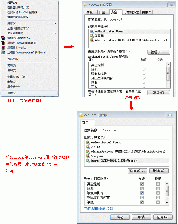 1、我們先在我們電腦上新建一個文件夾(D盤或E盤或F盤,不建議放桌面),建議命名為英文名稱,如:D:\wwwroot(名稱任何改),然后設(shè)置好目錄權(quán)限,如下圖: