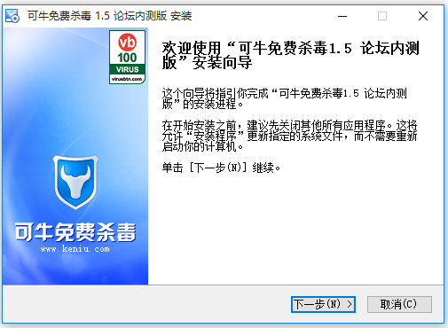 下載可牛殺毒軟件,歡迎使用“可牛免費(fèi)殺毒1.5論壇內(nèi)測版姿裝向?qū)?,單擊〔下一?H)]維續(xù)。