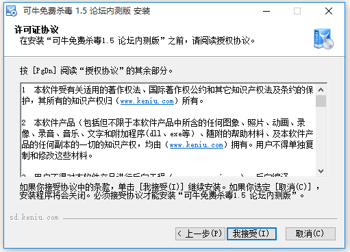 在安裝“可牛免費(fèi)殺毒1.5 論壇內(nèi)則版”之前,請閱讀授權(quán)協(xié)議。