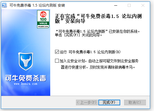 安裝完成,成“可牛免費(fèi)殺毒1.5論壇內(nèi)測版安裝向?qū)В?/p>