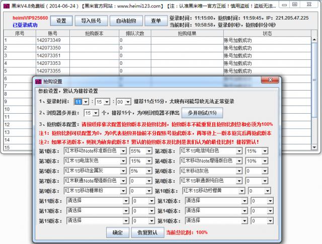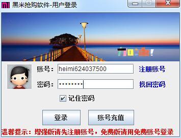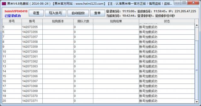 如今的黑米已經(jīng)強大到可以秒殺市面上一切軟件!支持用戶導入最多100個賬號!全自動搶購!支持后臺操控!一個賬號多臺電腦使用!大部分搶購全自動過碼!支持爛單返點!最給力,最方便,最省心的搶購賺錢神器!
