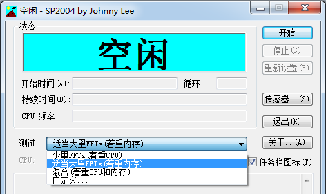1.自該頁下載解壓后,運行 SP2004.exe,打開軟件,點擊“測試”下拉框,選擇“適當大量FFT(著重內(nèi)存)”選項,在“cpu”下拉框中選擇“所有cpu”