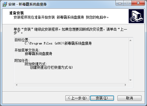 現(xiàn)在將安裝新毒霸系統(tǒng)盤瘦身版本1.0正式版到您的電腦盧。