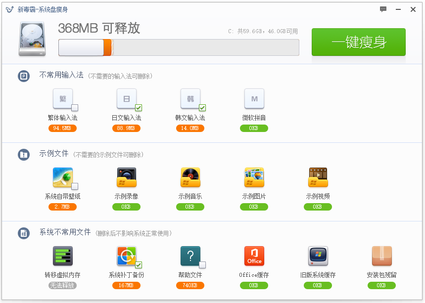 新毒霸系統(tǒng)盤瘦身單文件版是一款獨(dú)立的、免安裝的系統(tǒng)清理軟件,他是從金山新毒霸從提取出來的,可以有效清理電腦C盤中的垃圾文件,從而釋放磁盤空間,提升系統(tǒng)運(yùn)行速度。如果你喜歡這款系統(tǒng)盤瘦身工具但是又不想安裝金山毒霸的話那么kk下載小編的新毒霸系統(tǒng)盤瘦身獨(dú)立版就可以滿足你的需求!
