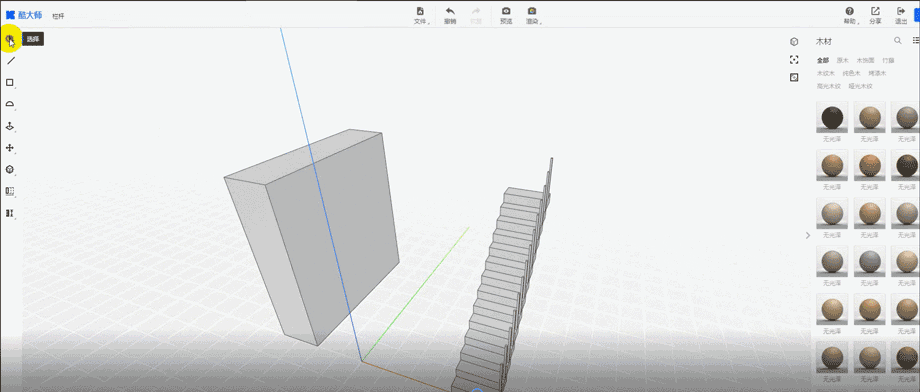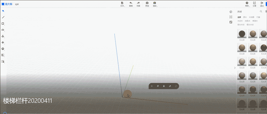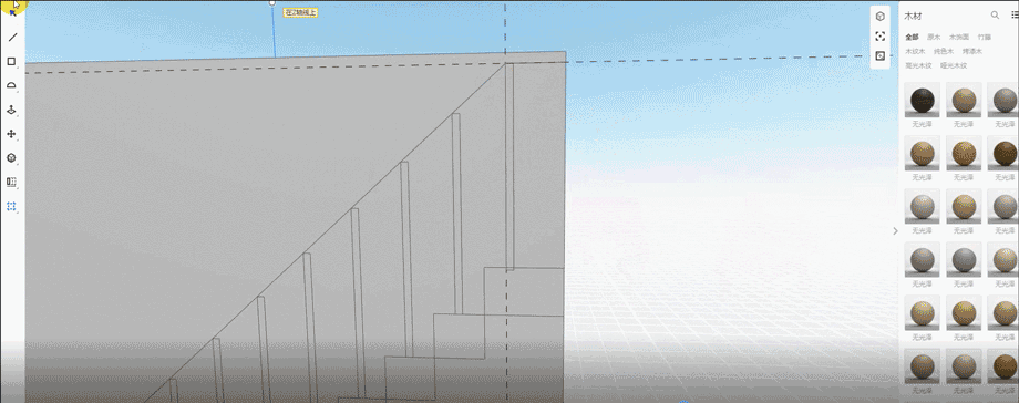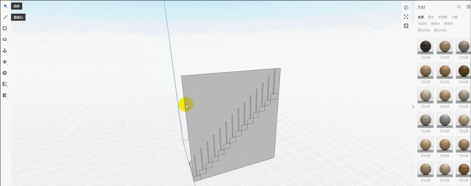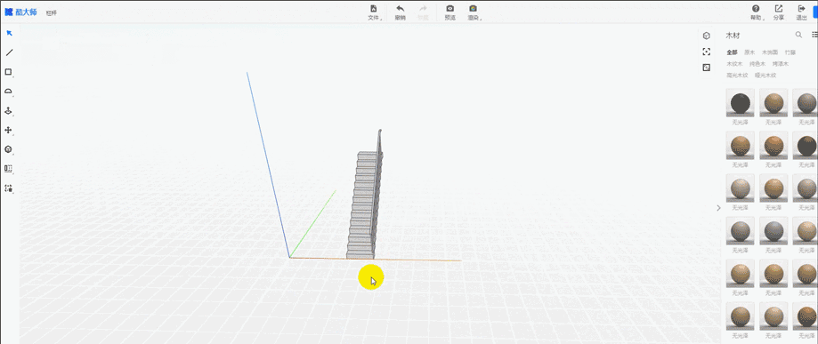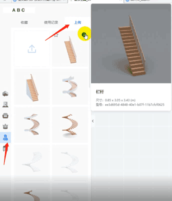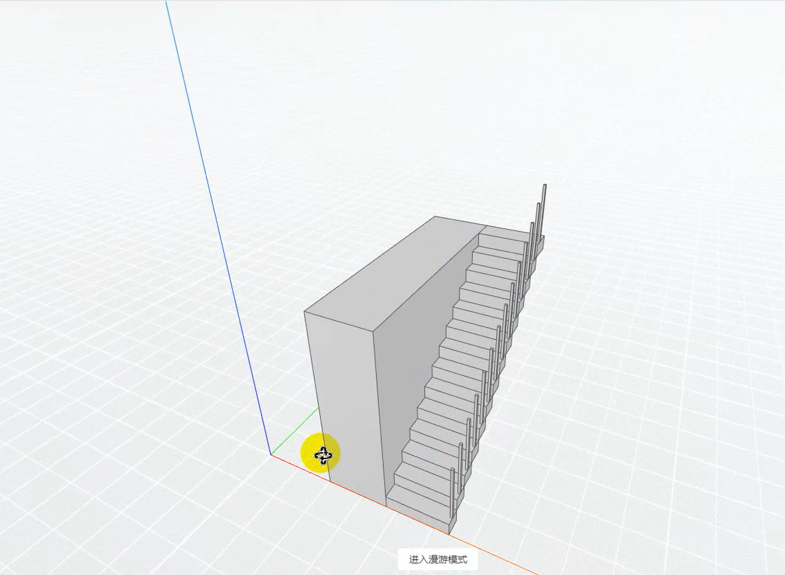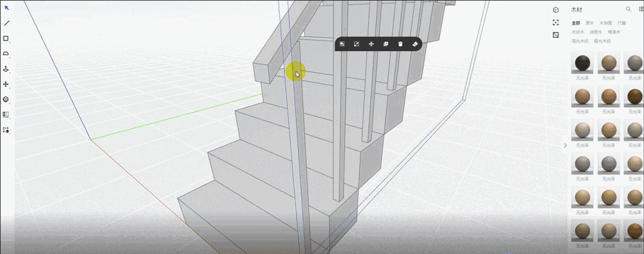 5.框選住扶手和立柱將其稍微往內(nèi)移一些距離,可以看到扶手和立柱之間有空隙,雙擊單個(gè)立柱,將其拉伸調(diào)高。最后在框選住整個(gè)模型附上材質(zhì),這樣樓梯及護(hù)欄模型就做好了,點(diǎn)擊右上角“發(fā)布”之后就可以在素材庫(kù)中“我的”里面找到使用了