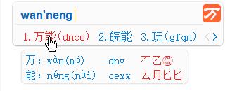 使用萬能五筆輸入漢字時,鼠標懸浮在候選框中的漢字上,便展示該候選內容的五筆編碼、五筆字根拆分編碼及漢字拼音標注等內容。如下圖: