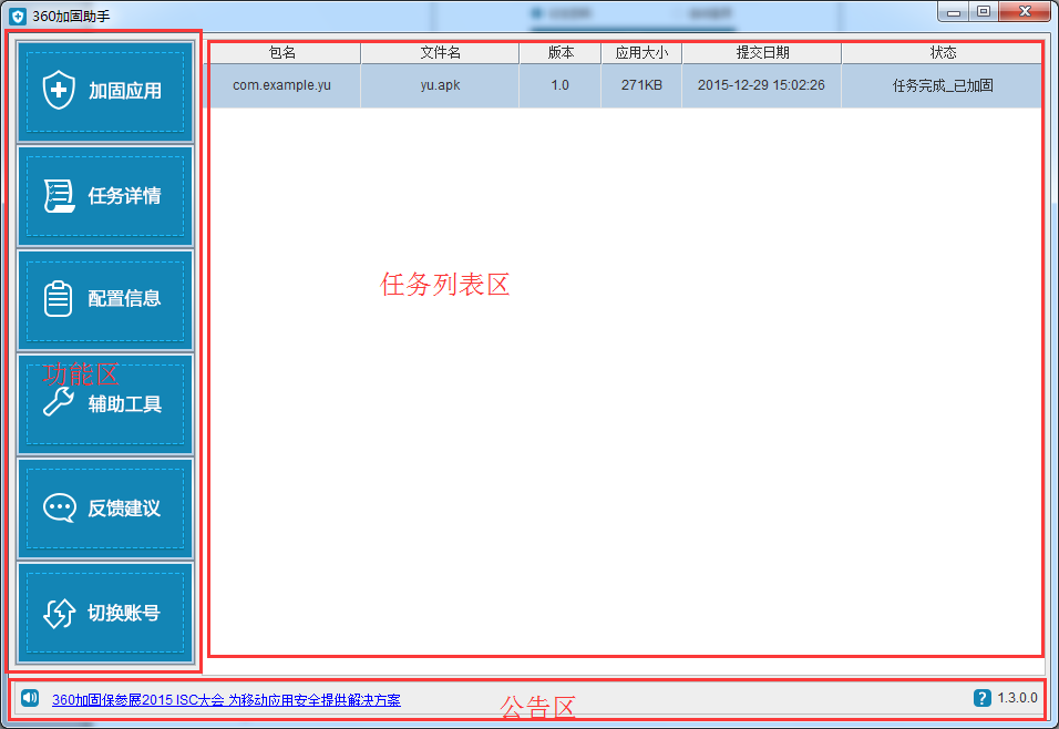360加固助手主界面支持任意拖拽,主要分三大區(qū)域。左側(cè)一欄六個按鈕為功能區(qū),顯示核心功能。右側(cè)為任務(wù)列表區(qū),顯示加固任務(wù),選中一項(xiàng)任務(wù),右鍵菜單項(xiàng)可執(zhí)行相關(guān)操作。主界面下方為公告區(qū),主要展示公告、幫助信息等。