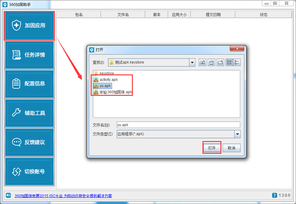 (1)主界面點(diǎn)擊“加固應(yīng)用”選擇要加固的apk文件。