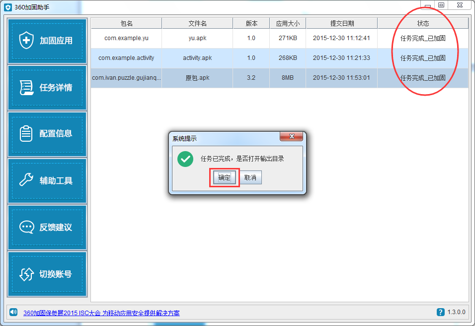 (4)加固完成后彈出提醒框。點(diǎn)擊“確定”打開APK輸出路徑(見下圖)。
