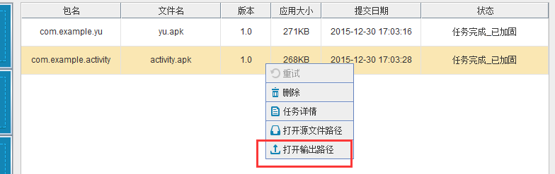 也可在列表里選中任務(wù),右擊鼠標(biāo)選擇“打開輸出文件所在路徑”。系統(tǒng)將自動打開APK輸出路徑。