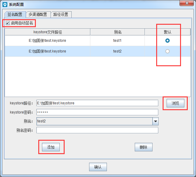 (2)勾選“啟動自動簽名”,點(diǎn)擊“瀏覽”按鈕,選擇Keystore文件(密鑰倉庫),輸入Keystore密碼,密碼正確后會顯示別名,然后輸入正確的別名密碼,點(diǎn)擊“添加”,然后單擊“確認(rèn)”或關(guān)閉按鈕即可。如下圖: