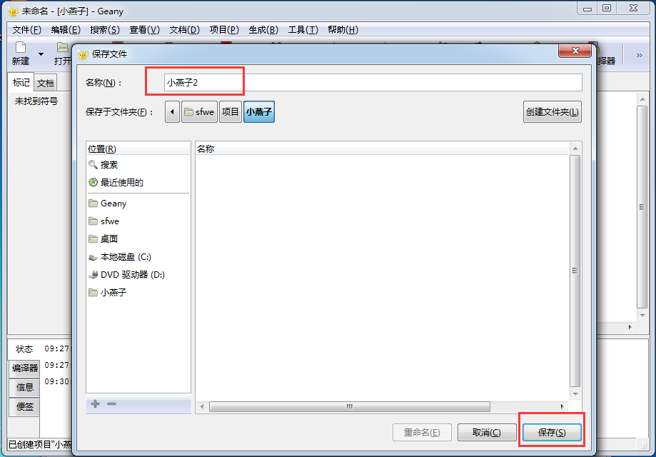 3.點(diǎn)擊文件另存為,將空白文件命名為“小燕子2”,保存到剛剛創(chuàng)建的小燕子項(xiàng)目中。